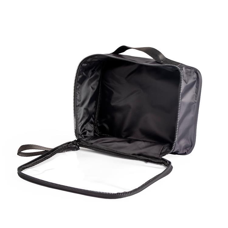 Nécessaire confeccionada em nylon, com frente em visor transparente, fechamento por zíper e alça superior. Inclui também uma alça de transporte em nylon, garantindo praticidade e fácil acesso aos itens organizados. Este brinde personalizado é a escolha ideal para quem busca um acessório funcional e prático para o dia a dia.